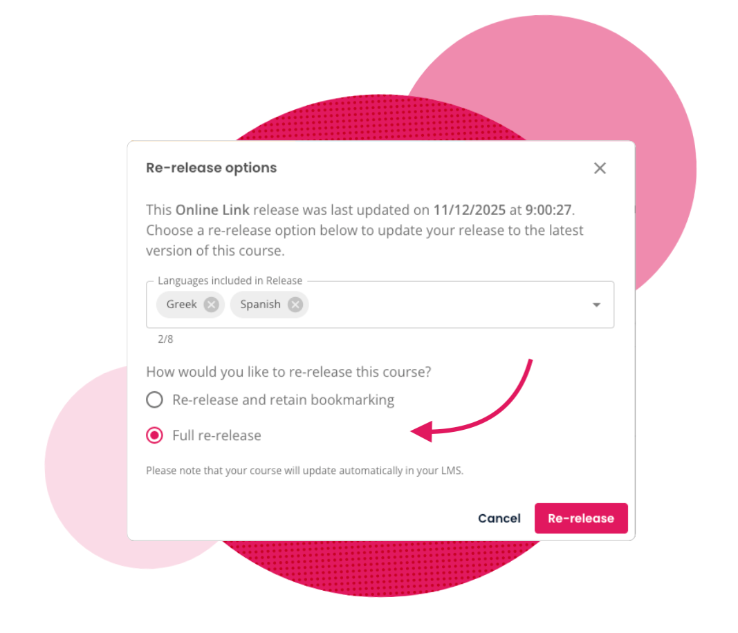 Speed up translation reviews and improve accuracy by seeing both versions tRe-release lets you update SCORM or Online Link projects quickly, helping you keep learners on the latest version with minimal admin.